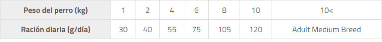 Beneficios RÁPIDA DIGESTIÓN. Fórmula Hipoalergénica con alto contenido de proteínas y grasas satisfacer la alta demanda de energía de las razas pequeñas. SOPORTE INMUNOLÓGICO. Manano/fructo-oligosacáridos prebióticos con inulina para el soporte inmunológico y modulación de la microflora intestinal. APARIENCIA PERFECTA. Altos niveles de ácidos grasos Omega-3 provenientes del aceite de salmón, dan soporte al sistema nervioso, una piel saludable y pelaje britllante. HIGIENE ORAL. Vitamina C, romero y clavo de olor para dientes, encías sanas y para la prevención de la acumulación de sarro.