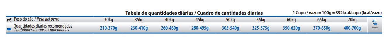 Humedad (máx.) 9%; Proteína Bruta (mín.) 30%; Extracto Etéreo (mín.) 18%; Materia Fibrosa (máx.) 2,9%; Materia Mineral (máx.) 6,8%; Calcio (mín.) 0,8%; Calcio (máx.) 1,5%; Fósforo (mín.) 0,7%; Sodio (mín.) 2.000mg/kg; Potasio (mín.) 5.000mg/kg; Magnesio (mín.) 900mg/kg; Omega 6 (mín.) 25g/kg; Omega 3 (mín.) 2.500mg/kg; DHA (mín.) 500mg/kg; EPA (mín.) 400mg/kg; Fructo-Oligosacáridos (mín.) 400mg/kg; Manano-Oligosacáridos (mín.) 240mg/kg; Metionina (mín.) 5.000mg/kg; Taurina (mín.) 1.000mg/kg; L-Carnitina (mín.) 100mg/kg; Lisina (mín.) 11g/kg; Sulfato de Condroitina (mín.) 200mg/kg; Sulfato de Glucosamina (mín.) 300mg/kg.
