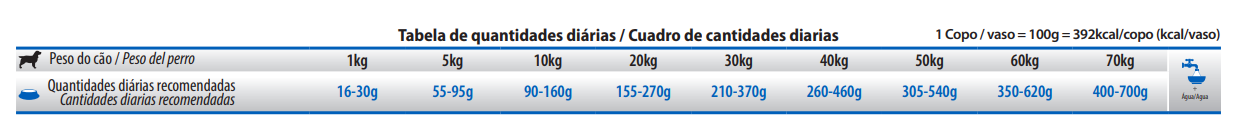 Humedad (máx.) 9%; Proteína Bruta (mín.) 30%; Extracto Etéreo (mín.) 18%; Materia Fibrosa (máx.) 2,9%; Materia Mineral (máx.) 6,8%; Calcio (mín.) 0,8%; Calcio (máx.) 1,5%; Fósforo (mín.) 0,7%; Sódio (mín.) 2.000mg/kg; Potássio (mín.) 5.000mg/kg; Magnésio (mín.) 900mg/kg; Omega 6 (mín.) 25g/kg; Omega 3 (mín.) 2.500mg/kg; DHA (mín.) 500mg/kg; EPA (mín.) 400mg/kg; Fructo-Oligosacáridos (mín.) 400mg/kg; Manano-Oligosacáridos (mín.) 240mg/kg; Metionina (mín.) 5.000mg/kg; Taurina (mín.) 1.000mg/kg; L-Carnitina (mín.) 100mg/kg; Lisina (mín.) 11g/kg; Sulfato de Condroitina (mín.) 200mg/kg; Sulfato de Glucosamina (mín.) 300mg/kg.