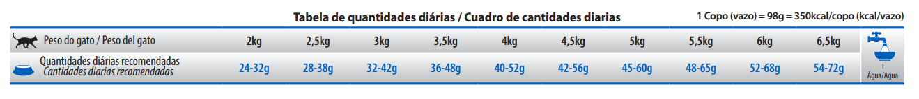 Humedad (máx.) 8%; Proteína Bruta (mín.) 46%; Extracto Etéreo (mín.) 11%; Materia Fibrosa (máx.) 5,1%; Materia Mineral (máx.) 8,9%; Calcio (mín.) 0,8%; Calcio (máx.) 1,6%; Fósforo (mín.) 0,8%; Sodio (mín.) 2.000mg/kg; Potasio (mín.) 6.000mg/kg; Magnesio (mín.) 900mg/kg; Omega 6 (mín.) 15,5g/kg; Omega 3 (mín.) 2.800mg/kg; DHA (mín.) 600mg/kg; EPA (mín.) 500mg/kg; Taurina (mín.) 2.000mg/kg; L-Carnitina (mín.) 100mg/kg; Metionina (mín.) 8.000mg/kg; Lisina (mín.) 14g/kg; Sulfato de Glucosamina (mín.) 300mg/kg; Sulfato de Condroitina (mín.) 200mg/kg; Manano-Oligosacáridos (mín.) 400mg/kg; Fructo-Oligosacáridos (mín.) 600mg/kg.