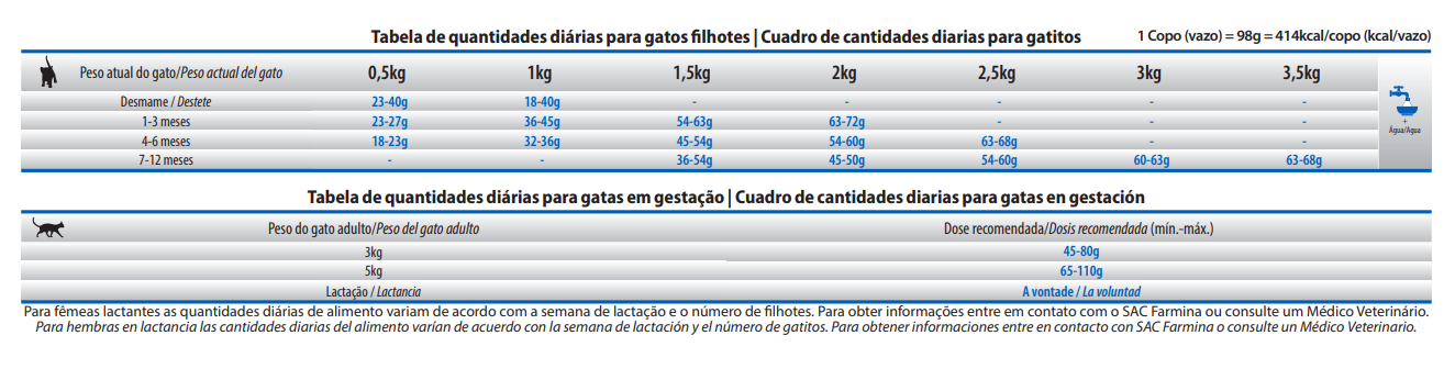 Humedad (máx.) 8%; Proteína Bruta (mín.) 44%; Extracto Etéreo (mín.) 22%; Materia Fibrosa (máx.) 1,8%; Materia Mineral (máx.) 8,5%; Calcio (mín.) 1,1%; Calcio (máx.) 1,5%; Fósforo (mín.) 0,88%; Sodio (mín.) 2.000mg/kg; Potasio (mín.) 5.000mg/kg; Magnesio (mín.) 900mg/kg; Omega 6 (mín.) 30g/kg; Omega 3 (mín.) 4.100mg/kg; DHA (mín.) 1.000mg/kg; EPA (mín.) 900mg/kg; Taurina (mín.) 2.000mg/kg; L-Carnitina (mín.) 100mg/kg; Metionina (mín.) 8.000mg/kg; Lisina (mín.) 16g/kg; Sulfato de Glucosamina (mín.) 300mg/kg; Sulfato de Condroitina (mín.) 200mg/kg; Manano-Oligosacáridos (mín.) 400mg/kg; Fructo-Oligosacáridos (mín.) 1.000mg/kg.