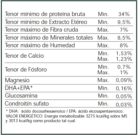 Harina de pavo, hidrolizado de hígado porcino deshidratado, arroz, arroz integral, celulosa en polvo, cebada, arvejas secas, pulpa de remolacha, Vitacel Psyllium, avena, aceite de pollo, coco deshidratado, aceite de pescado, zapallo deshidratado, semillas de chía, tomate deshidratado en polvo, aceite de coco, sal, taurina, probióticos, arándanos rojos (cranberries), extracto de manzanilla, jengibre en polvo, hinojo, extracto de romero, menta molida, arándanos liofilizados (blueberries), extractos vegetales naturales (té verde), aceite de raya, glucosamina, condroitín sulfato, L-carnitina, fructooligosacáridos, hexametafosfato de sodio. Vitaminas: A, C, D3, E, B1, B2, B6, B12, biotina, ácido fólico, niacina, ácido pantoténico, cloruro de colina. Minerales: hierro, cobre, zinc, selenio, manganeso, yodo, calcio.